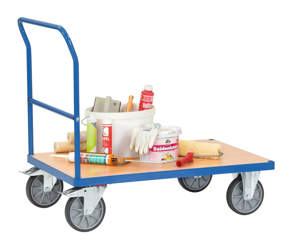· Schweißkonstruktion aus Stahlrohr und Profilstahl · RAL 5007 brillantblau pulverbeschichtet · Schlag- und kratzfest · Ladefläche und Stirnwände Holzwerkstoffplatte mit Buchendekor · Stirn- und Längswandhöhe 500 mm · 2 Lenk- und 2 Bockrollen · Lenkrollen mit Rad-Feststeller · TPE-Bereifung (thermoplastisches Elastomer) · Naben mit Rillenkugellager