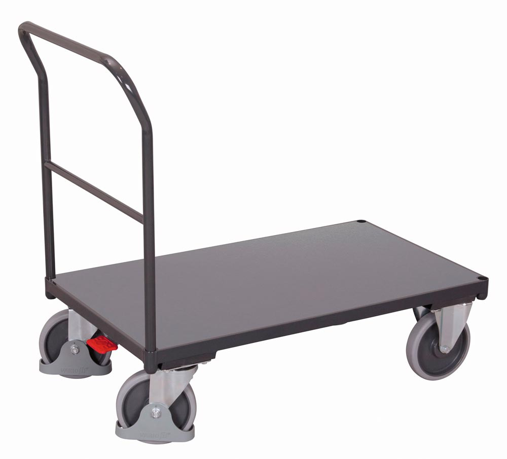 ∙ Schweißkonstruktion aus Stahlrohr und Profilstahl ∙ Schlag- und kratzfest ∙ Ladefläche und Stirnwände Holzwerkstoffplatte mit Buchendekor ∙ Stirn- und Längswandhöhe 515 mm ∙ 2 Lenk- und 2 Bockrollen · Lenkrollen gemäß EN 1757-3 mit zentraler Fußbremse EasySTOP und Fußschutz · Thermoplastische Vollgummi-Bereifung, grau "spurlos" · Naben mit Präzisions-Rillenkugellager und Fadenschutz