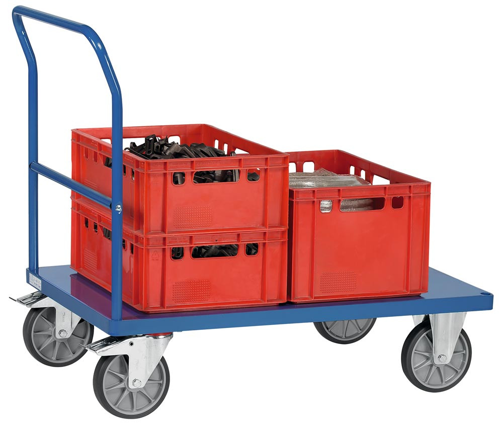 · Schweißkonstruktion aus Stahlrohr und Profilstahl · Ladefläche aus Stahlblech, bündig mit Rahmen · RAL 5007 brillantblau pulverbeschichtet · Schlag- und kratzfest · 2 Lenk- und 2 Bockrollen · Lenkrollen gemäß EN 1757-3 mit Rad-Feststeller · TPE-Bereifung (thermoplastisches Elastomer) · Naben mit Rillenkugellager