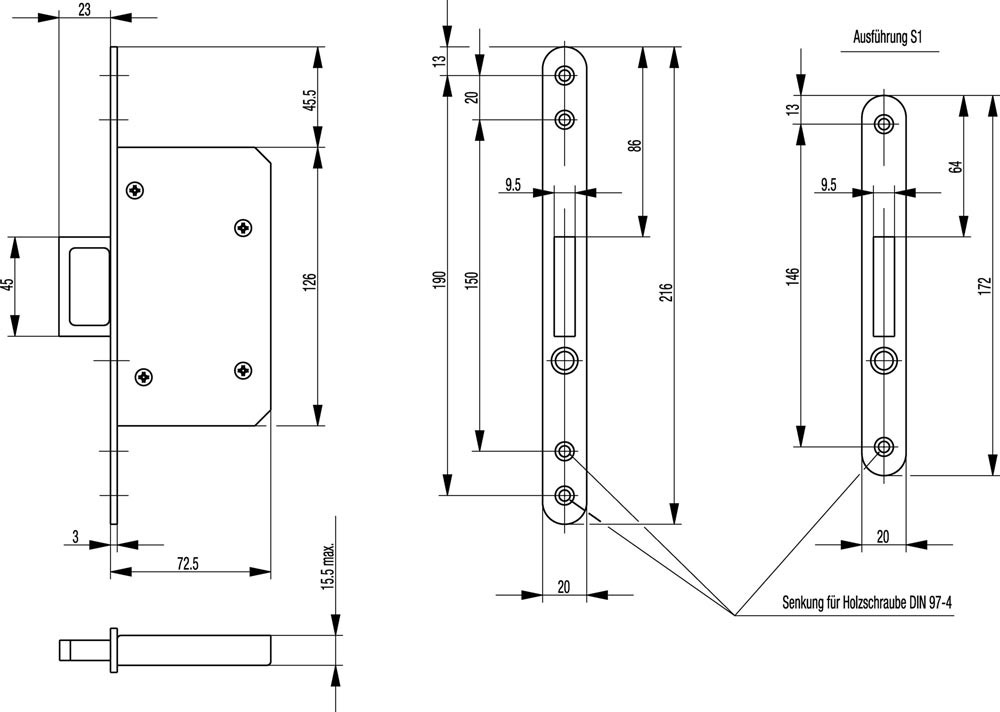 Schiebetür-Einsteckschloss 0393 Stahl silber käntig 20/55 mm mit Springgriff und Auslöseknopf E6427739