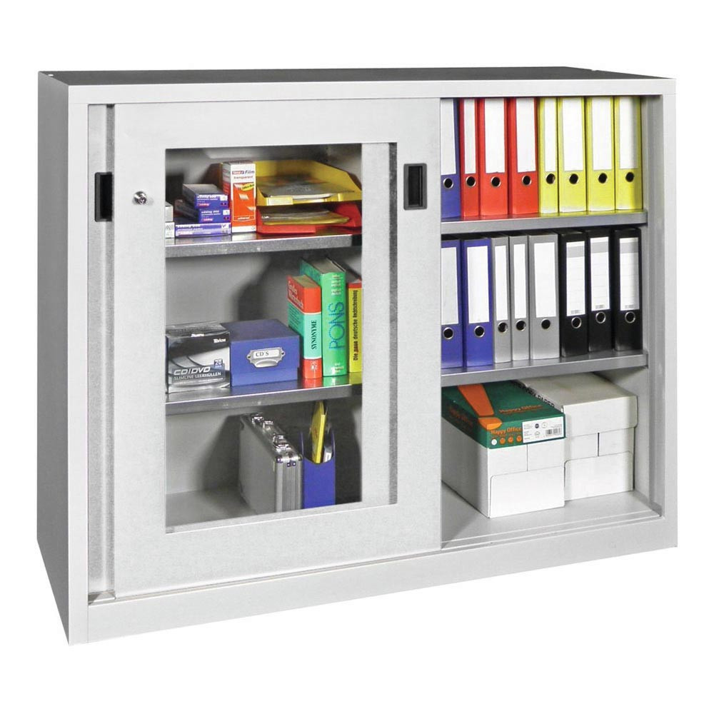 Schiebetürenschrank, Sichtfenstertüren, 2 verzinkte Böden, ohne Trennwand, BxTxH 1000x400x1200 mm, RAL 7035/3000 E875449