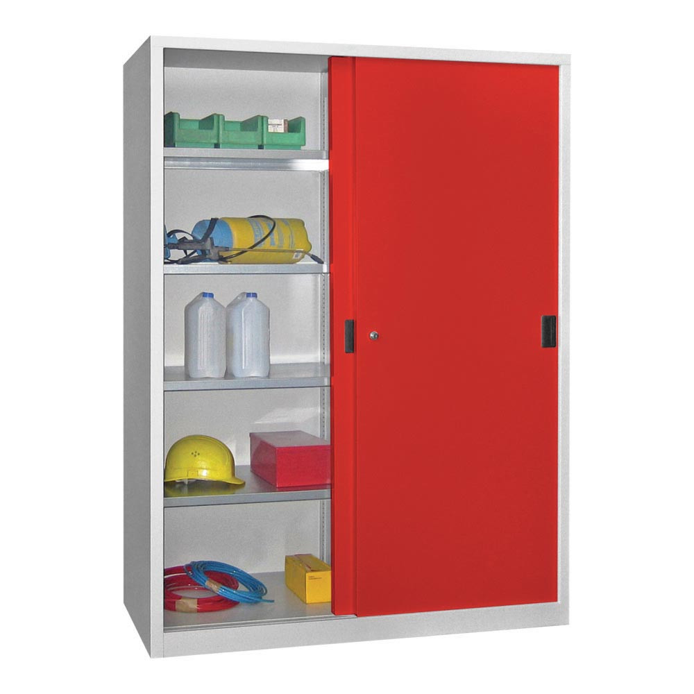 ∙ Korpus aus geschweißtem Stahlblech mit hochwertiger Pulverbeschichtung ∙ Türen mit Verstärkungstaschen, auf Spezialrollen im oberen Führungsprofil sicher geführt und mit Quetschschutz, auf Puffer aufschlagend ∙ Gemeinsam durch Drehdruckzylinder verschließbar, inkl. 2 Schlüsseln ∙ Serienmäßig verzinkte Fachböden, im Raster von 17 mm höhenverstellbar und mit 80 kg belastbar ∙ Gesamt-Belastbarkeit: Schränke ohne Trennwand 500 kg, mit Trennwand 600 kg (Traglastangaben verstehen sich bei gleichmäßig verteilter Last)