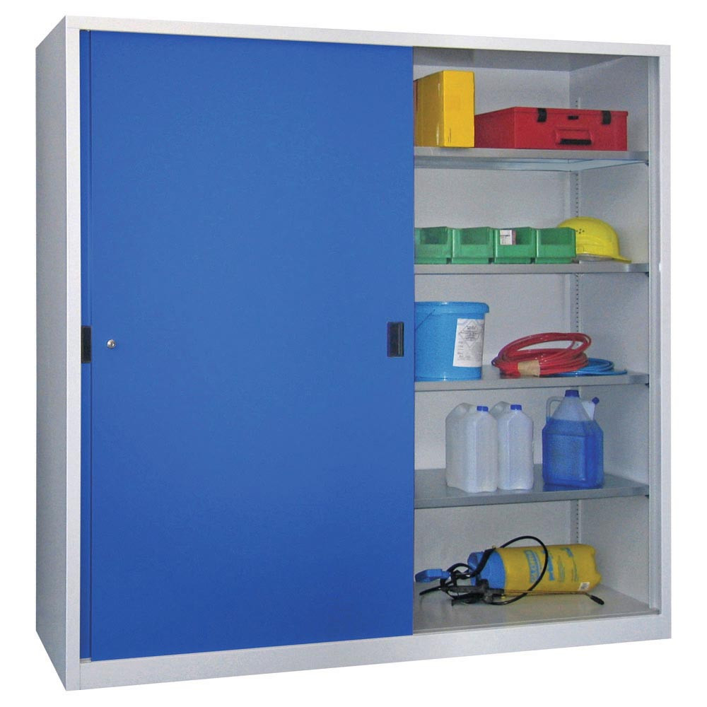 ∙ Korpus aus geschweißtem Stahlblech mit hochwertiger Pulverbeschichtung ∙ Türen mit Verstärkungstaschen, auf Spezialrollen im oberen Führungsprofil sicher geführt und mit Quetschschutz, auf Puffer aufschlagend ∙ Gemeinsam durch Drehdruckzylinder verschließbar, inkl. 2 Schlüsseln ∙ Serienmäßig verzinkte Fachböden, im Raster von 17 mm höhenverstellbar und mit 80 kg belastbar ∙ Gesamt-Belastbarkeit: Schränke ohne Trennwand 500 kg, mit Trennwand 600 kg (Traglastangaben verstehen sich bei gleichmäßig verteilter Last)
