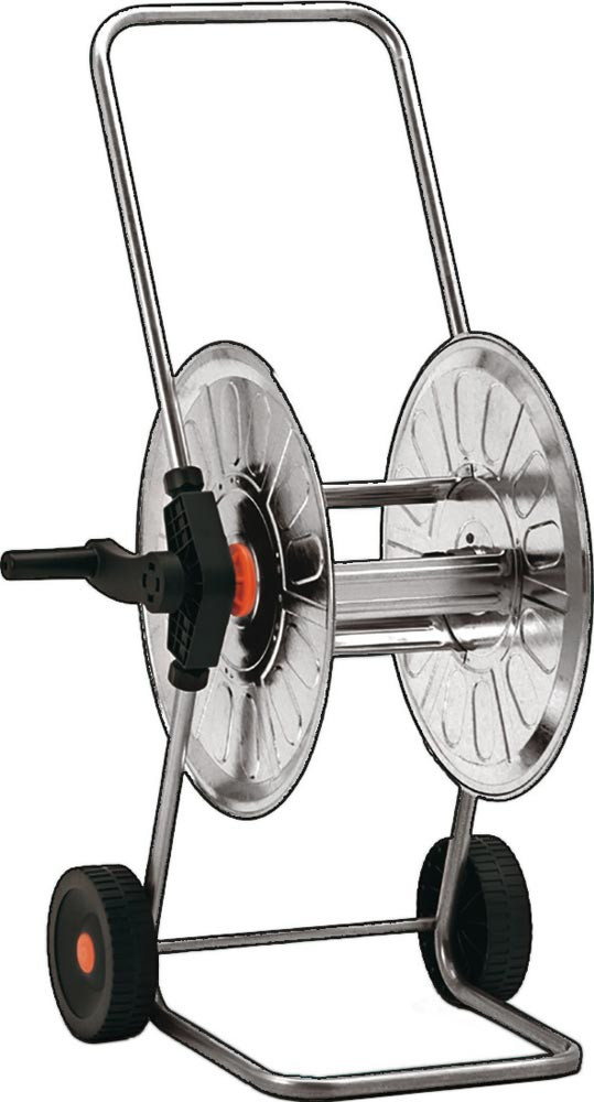 Handkurbel für Links- und Rechtsanbau · komplett zerlegbar · Fahrgestell und Schlauchtrommel: Stahlrohr/Stahlblech verzinkt · Verbindungselemente, Handkurbel und Räder: Kunststoff schwarz