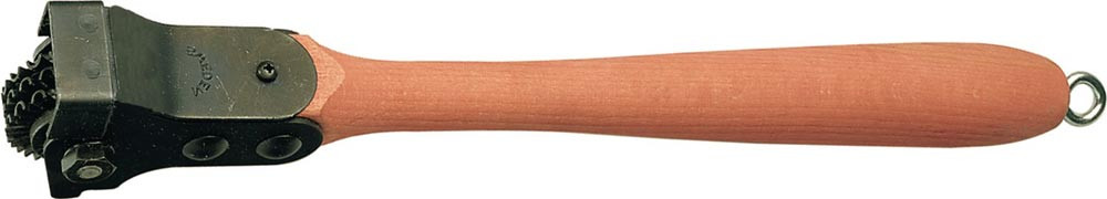 stabiles Griffstück aus Edelholz für festes, bequemes und beidhändiges Zupacken · Stütznasen zur Erleichterung, gleichmäßiges Anlegen der Rolle an die Schleifscheibe · zur Vereinfachung seitlicher Bewegungen, um die gesamte Breite der Schleifscheibe abzurichten · Schutzblech zur Verhinderung sprühender Funken gegen Gesicht und Hände