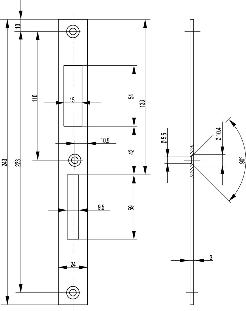 Schließblech S491 Edelstahl Breite 24 x Länge 243 mm käntig DINlinks / rechts flach