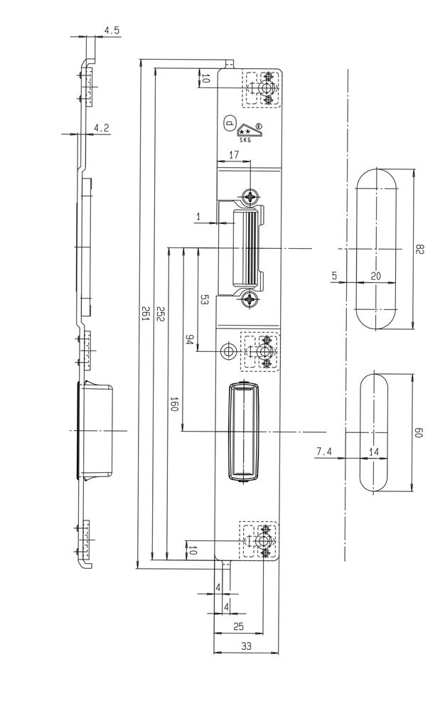 Schließteil Falle/Riegel Flachstulp 33 mm rechts silberfarbig