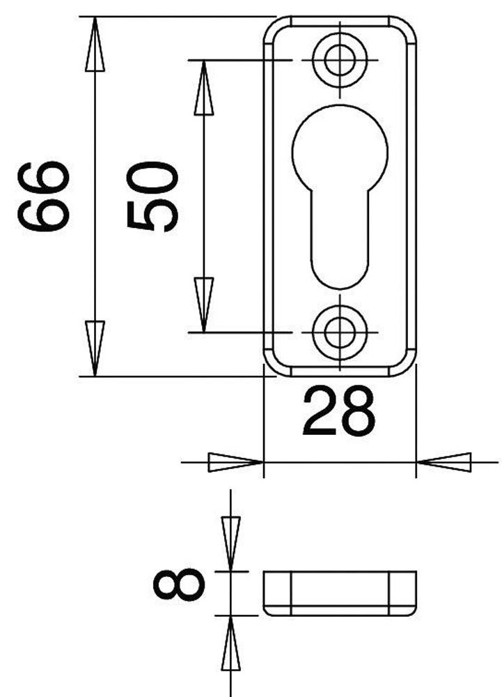 für Rahmentüren · Lochung PZ · Höhe 66,5 mm · Breite 28 mm · Schildstärke 8 mm · Kanten gerundet · sichtbare Verschraubung · Lieferung ohne Schrauben