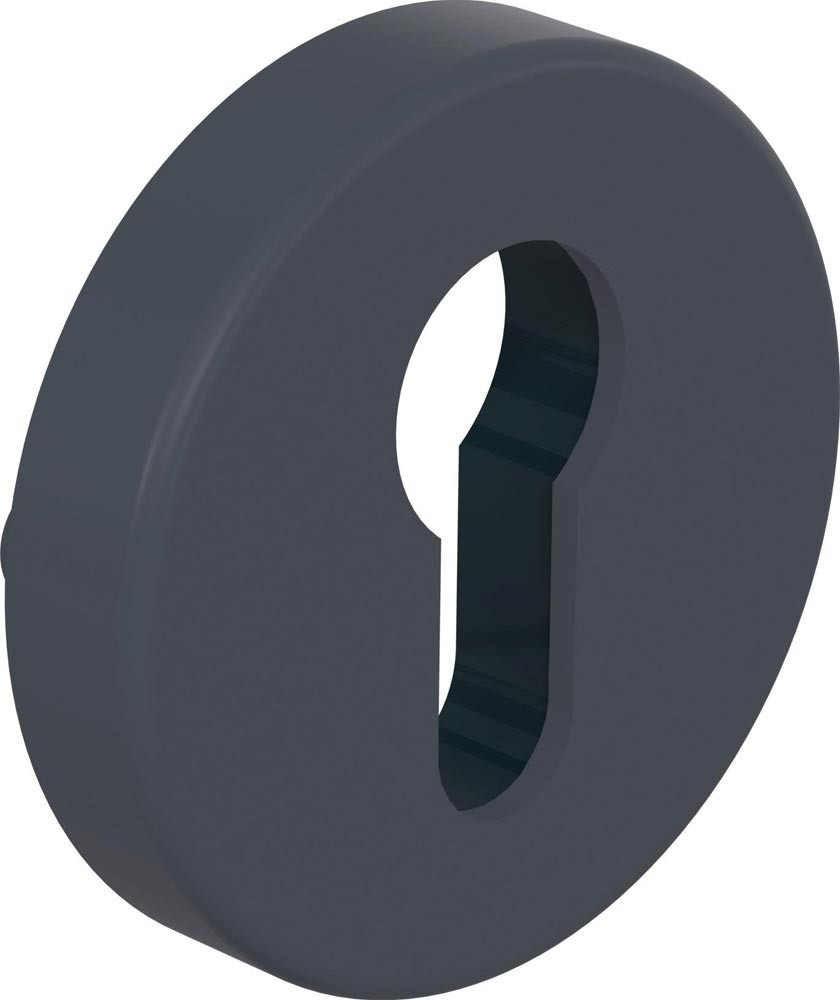 Schlüsselrosettenpaar · Polyamid durchgängig eingefärbt · DIN links und DIN rechts verwendbar · Verdeckte, lockerungssichere Verschraubung mit 5 mm Spaxschrauben sowie in das Türblatt eintauchenden Stützzapfen · Rosetten-Abdeck-Kappe, rund, Durchmesser 55 mm, 10,5 mm hoch, 1,5 mm Wandstärke · für TS 38,1 - 48,0 mm · Edition matt