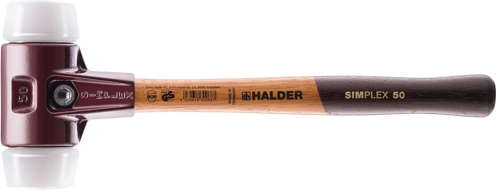 2-teiliges Spanngehäuse aus Temperguss · auswechselbare Schlagköpfe aus weißem Superplastik · mittelhart · sehr widerstandsfähig · verschleißfest · Holzstiel · mittelharter Schlag · Anwendungsbereiche: