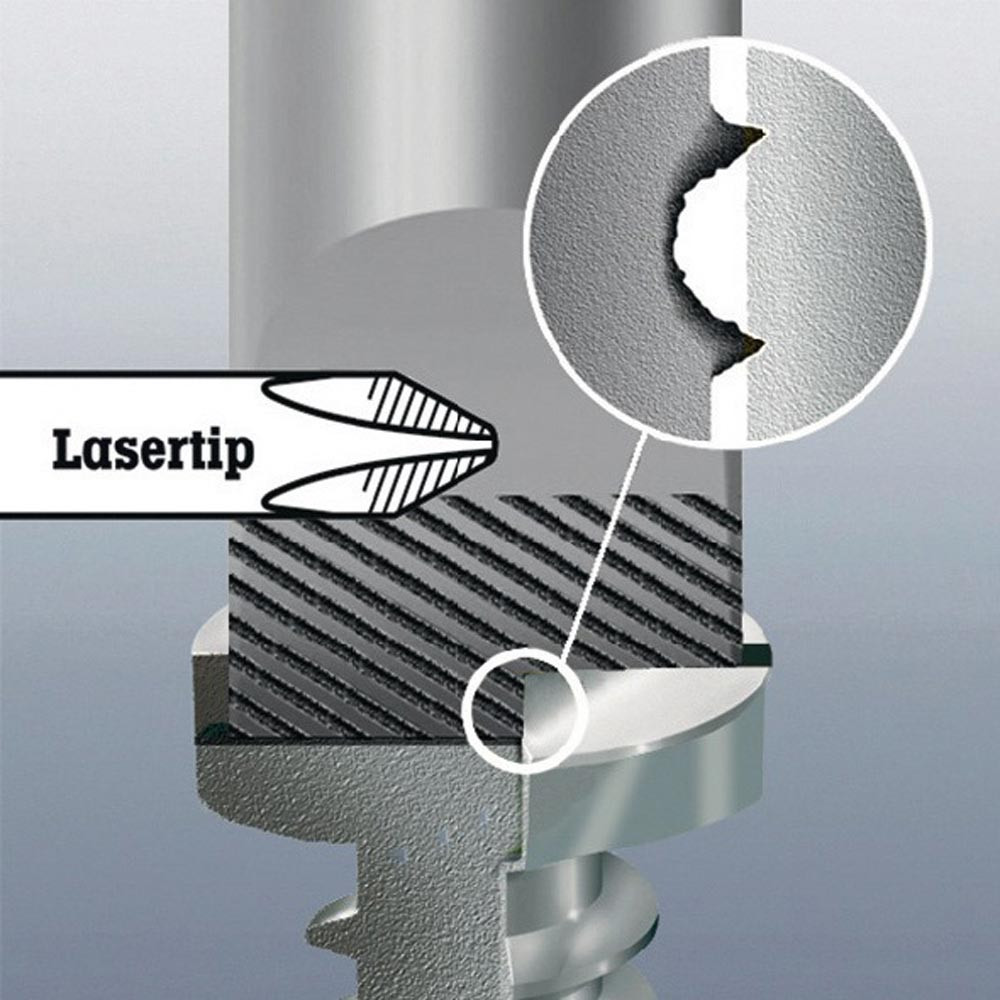 Mehrkomponenten-Kraftform-Heft mit Abrollschutz · mit harten Griffzonen für hohe Arbeitsgeschwindigkeit und weichen Griffzonen für hohe Drehmomentübertragung · Klinge aus hochwertigem Molybdän-Vanadium-Stahl · nicromatt mit Lasertip-Spitze · "beißt" sich im Schraubenkopf fest und verhindert ein Herausrutschen aus dem Schraubenkopf und schützt vor teuren Ausrutschern · es entfällt der größte Teil des benötigten Anpressdrucks · unverlierbares Größenleitsystem am Griffende als zeitsparende Erkennungshilfe für die jeweilige Schraubenart