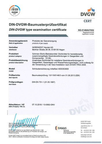 mittelfest, hochviskos · ein 1-komponentiger anaerober Flüssigkunststoff, härtet bei Kontakt mit Metallen unter Luftausschluss aus · ersetzt herkömmliche Befestigungsmethoden wie Splinte, Federringe und Scheiben · handfest nach ca. 10 bis 20 Min. · funktionsfest nach 1 bis 3 Std.· Viskosität: 2.000 bis 7.500 mPas (25 °C) · Spaltfüllvermögen: 0,25 mm · max. Gewinde: M 36 · Festigkeitsklasse DIN 30661:2 · Losbrechmoment: 17 bis 22 Nm · Temperaturbereich von -55 °C bis +150 °C · klebt, dichtet und sichert Schraubverbindungen, Fügeteile, Lager und Rohrverbindungen einfach, sicher und dauerhaft · mit DVGW-Freigabe für den Trinkwasserbereich