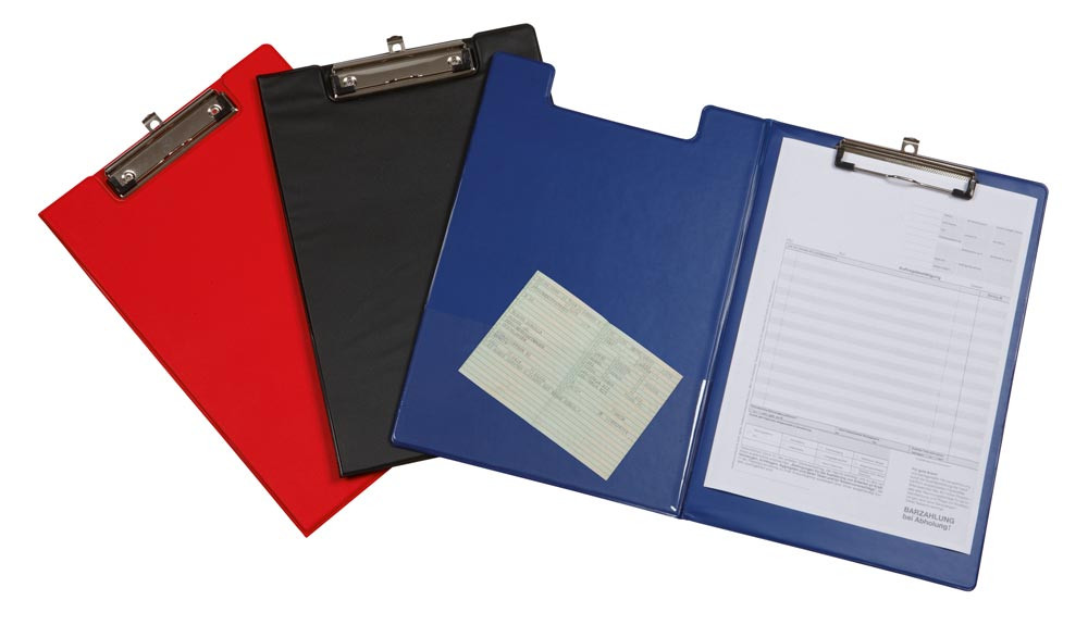 ∙ Mit Blockklemme und Aufhängeöse ∙ Einstecktaschen aus Klarsichtfolie · Format DIN A4 ∙ VE 12 Stück