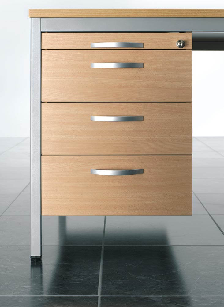 ∙ Vormontiert ∙ Melaminharzbeschichtete E-1-Spanplatten, 19 mm stark, mit 2 mm ABS-Umleimer, Radius 2 mm gerundet ∙ Stahlschubfächer auf Kugelführung mit Einzelauszugssperre, Zentralverschluss und Zylinderschloss ∙ Metallgriffe ∙ Ausgestattet mit 1 Utensilienschub (25 mm hoch, 2/3 ausziehbar) und 3 Schubladen (130 mm hoch, 5/6 ausziehbar)