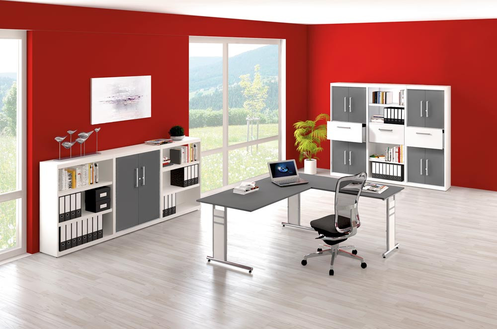 · Mit einem Anbautisch kann der Schreibtisch zu einer Eck-Kombination erweitert werden, z. B. für Besprechungen