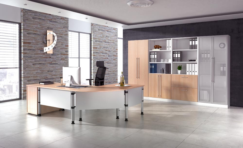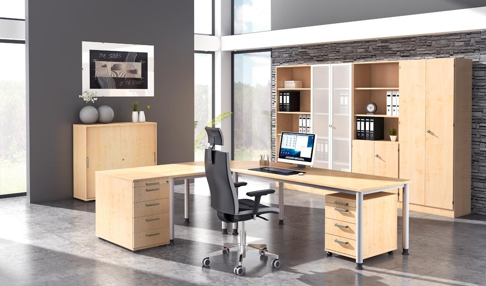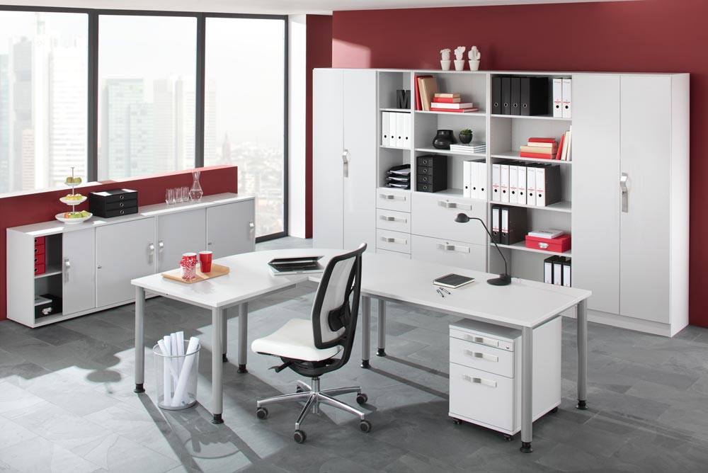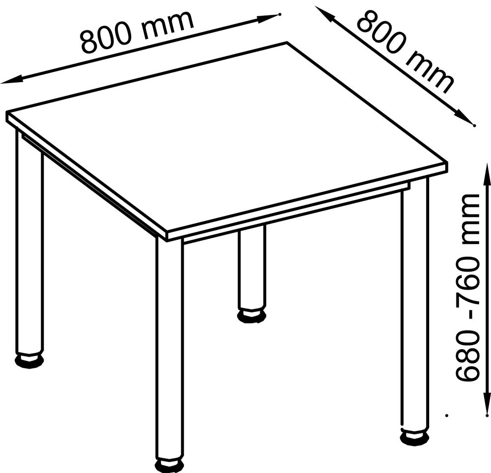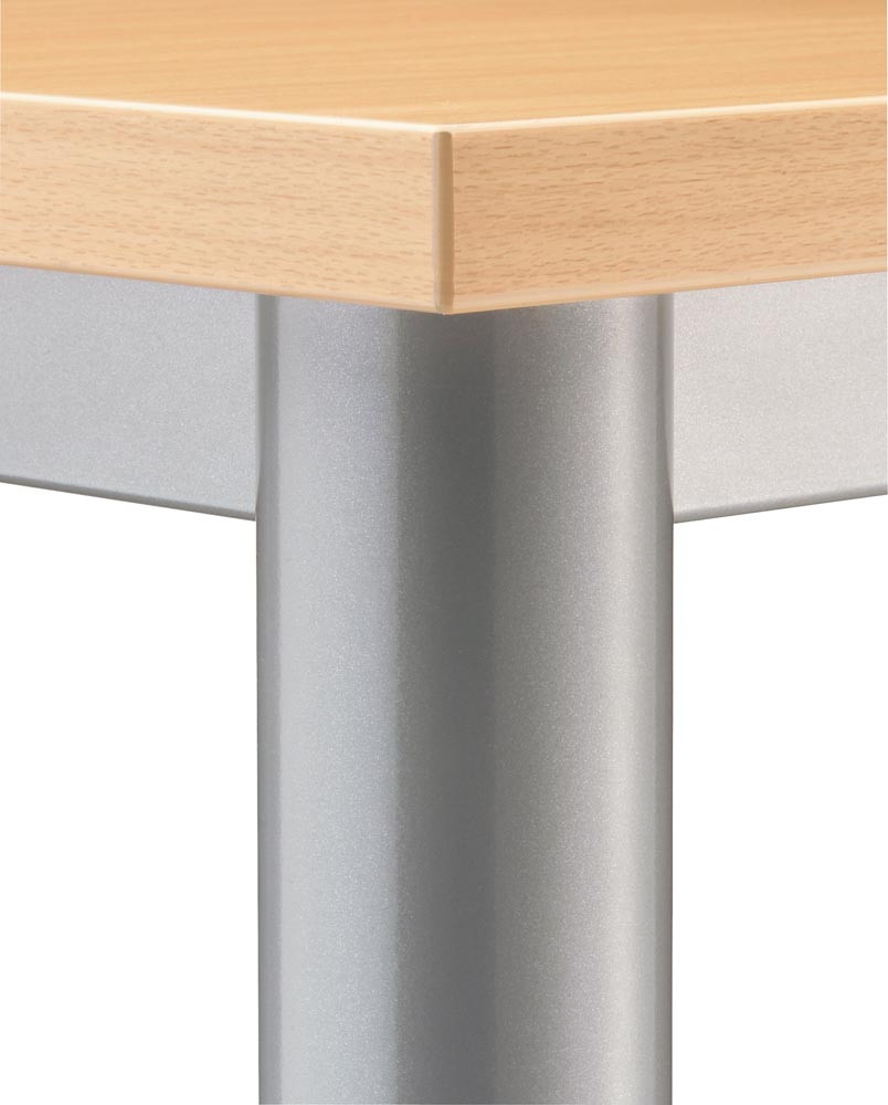 ∙ Platten 25 mm stark, beidseitig kunststoffbeschichtet, geprüft nach DIN 4554 ∙ Tischbeine aus Rundrohrstahl Ø 60 mm, höhenverstellbar , einbrennlackiert, weißaluminium ähnl. RAL 9006