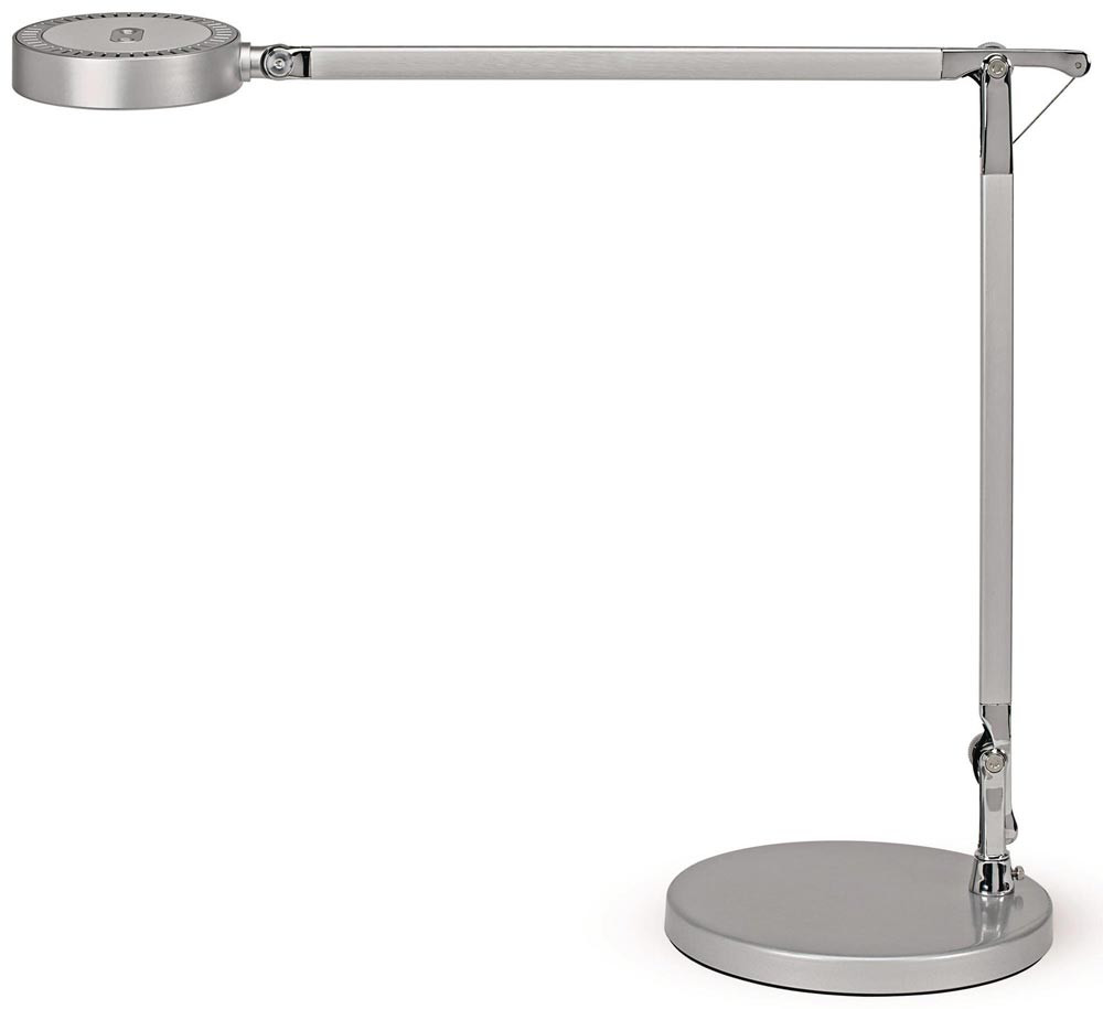 Schreibtischleuchte Metall/Aluminium ∙ mit Standfuß ∙ Bedienung über Touchfeld am Leuchtenkopf, stufenlos dimmbar, Diffusor für geringen Schattenwurf ∙ Leuchtenkopf Ø 116 mm – drehbar, neigbar ∙ Armlänge unten/oben 365 mm - Höhe max. 466 mm ∙ Betriebsspannung 220-240 V ∙ Lichtfarbe 3.000 Kelvin - warmweiß bis 6.500 Kelvin - tageslichtweiß ∙ Lebensdauer 20.000 Stunden ∙ Lichtstrom 618 Lumen ∙ gewichteter Energieverbrauch 6 kWh/1000h ∙ Effizienzklasse F (Spektrum A bis G)