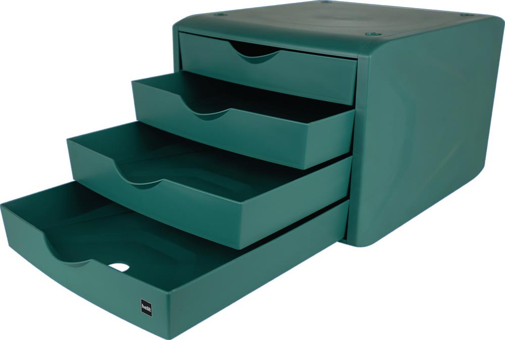 recycelter Kunststoff · stapelbar · 4 Schubladen für DIN A4 Formate · mit Auszugssperre · H 215 x B 265 x T 332 mm