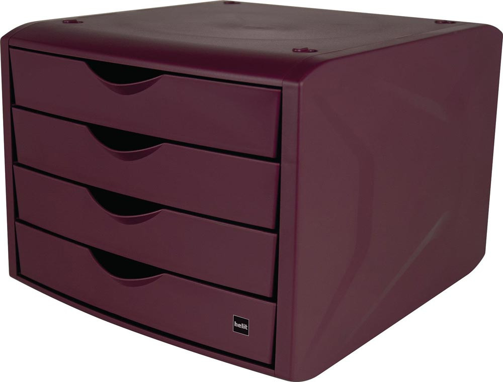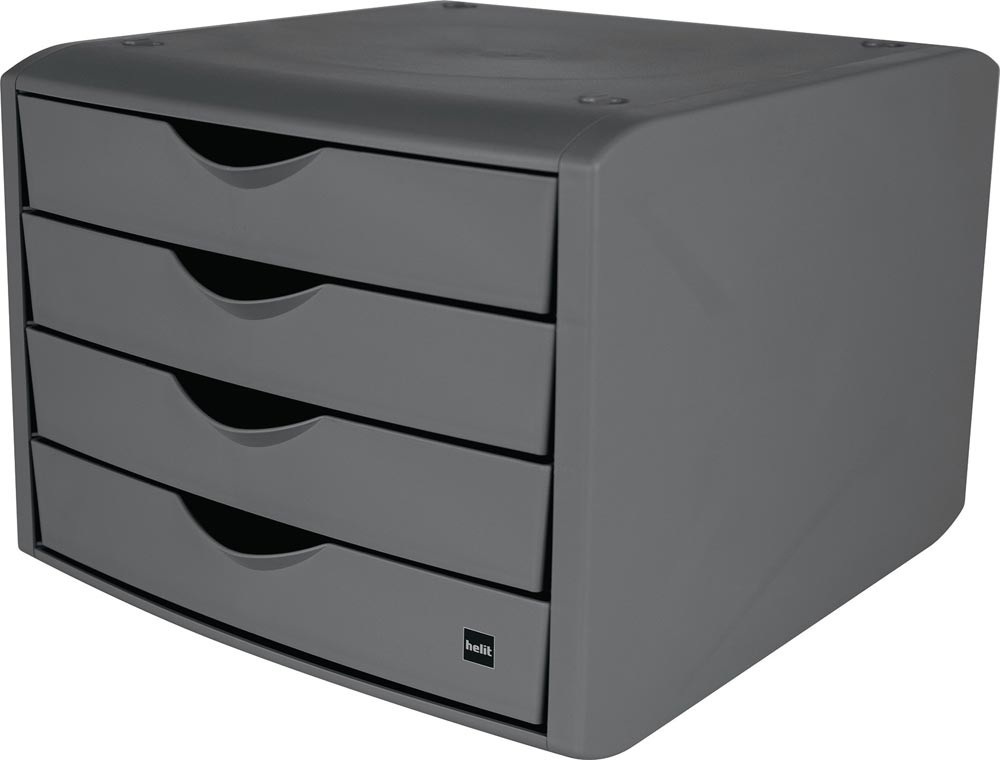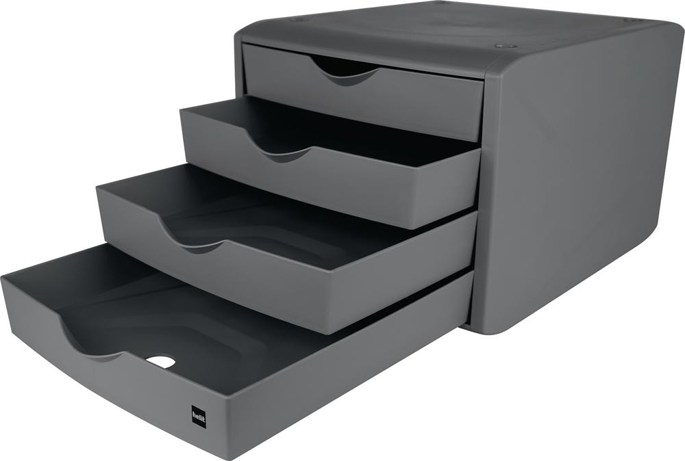 recycelter Kunststoff · stapelbar · 4 Schubladen für DIN A4 Formate · mit Auszugssperre · H 215 x B 265 x T 332 mm