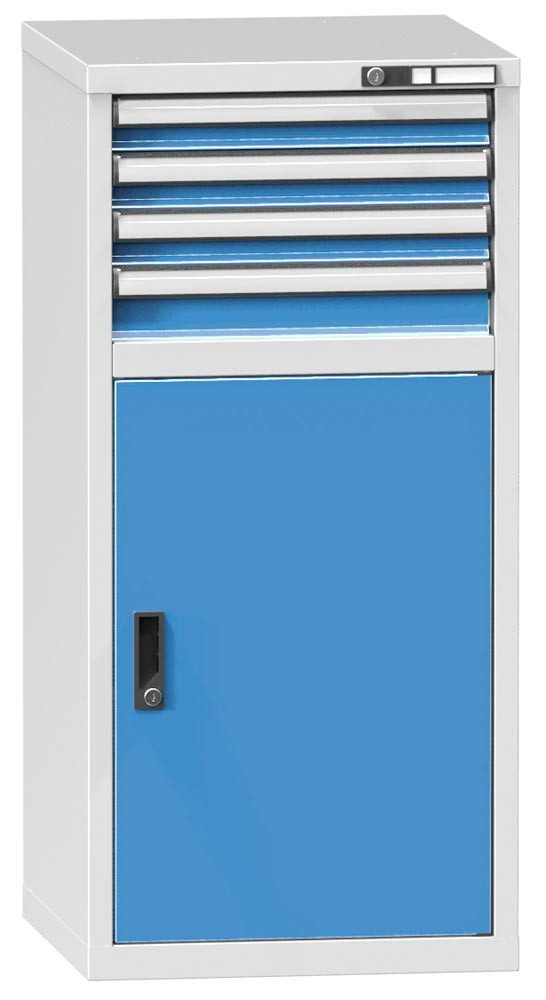 Schubladenschrank, 4 Schubladen: 3x75,x 1x100 mm,1 Tür, 2 Böden, BxTxH 578x600x1215 mm, RAL 7035/5012