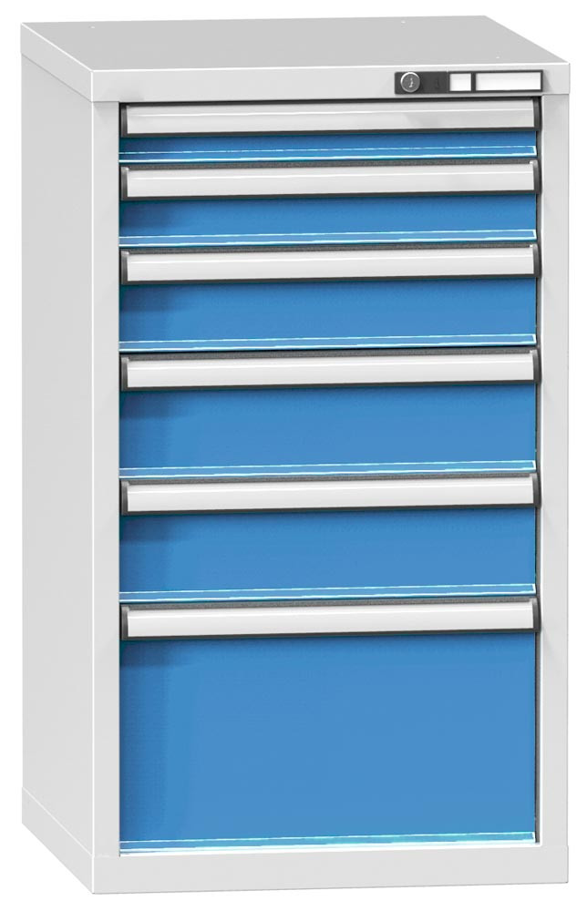 Schubladenschrank, 6 Schubladen: 1x75, 1x100, 1x125, 2x150, 1x300 mm, BxTxH 578x600x990 mm, RAL 7035/5012 E1613697