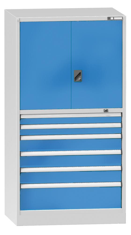 Schubladenschrank, 6 Schubladen: 2x100, 3x150, 1x250 mm, 1 Tür H 800 mm, 1 Tür H 800 mm, 1 Fachboden, BxTxH 1037x780x1950 mm, RAL 7035/5012