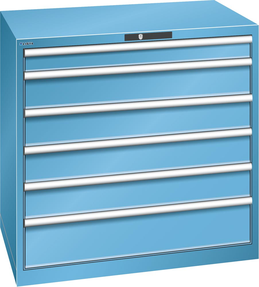 Schubladenschrank, Traglast/Schubl.: 75 kg, 6 Schubl.: 1x100, 4x150, 1x200 mm, Zylinderschloss, BxTxH 1023x725x1000 mm, RAL 5012 E1615119