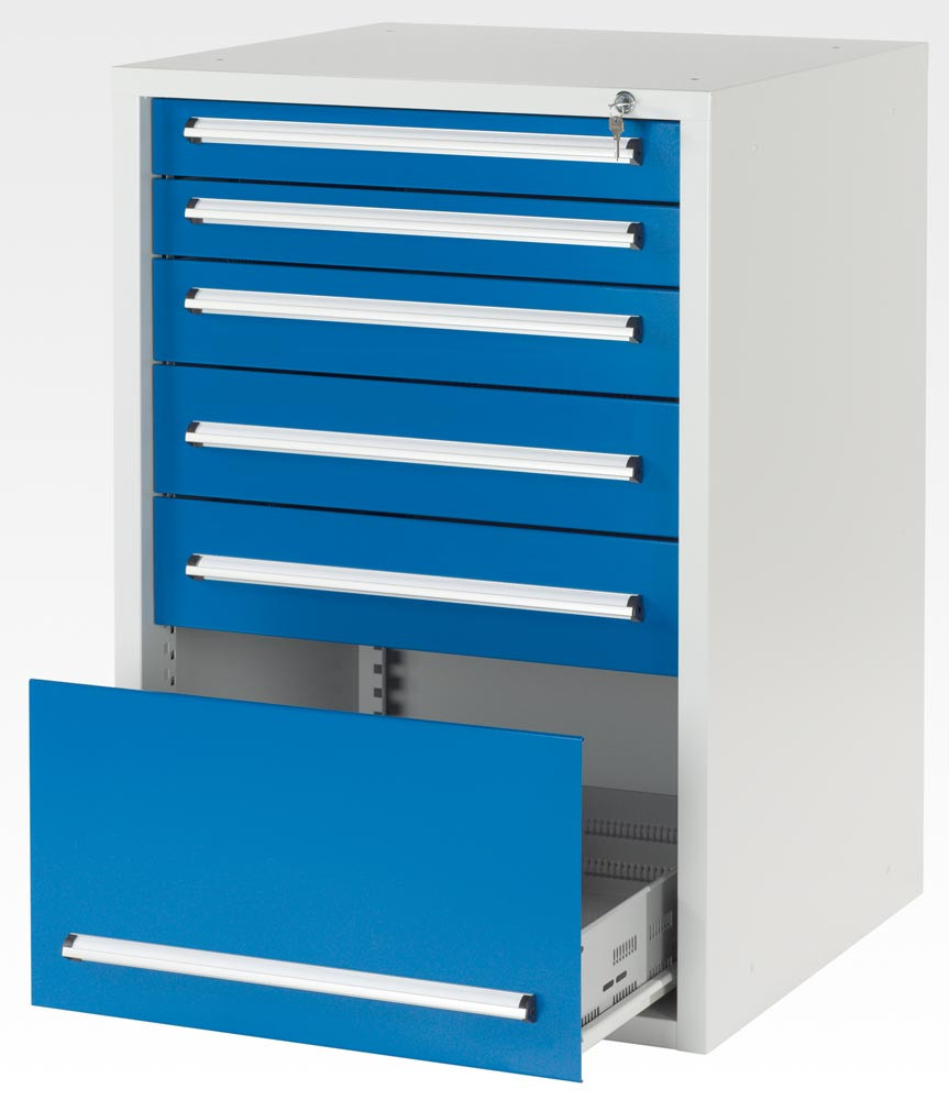 Ausführung: Robuste, verschweißte Stahlblech-Konstruktion, pulverbeschichtet für höchste Belastbarkeit ∙ 6 Schubladen mit 85% Teilauszug ∙ Tragkraft pro Schulade 100 kg - mit Schlitzreihen zur Aufnahme von Einteilungsmaterial ∙ Zentralverriegelung mit Sicherheitsschloss und Einzelauszugssperre ∙ Griffleisten aus Aluminium mit Beschriftungsstreifen und Klarsichtabdeckung ∙ Farbe RAL 7035 lichtgrau/RAL 5010 enzianblau