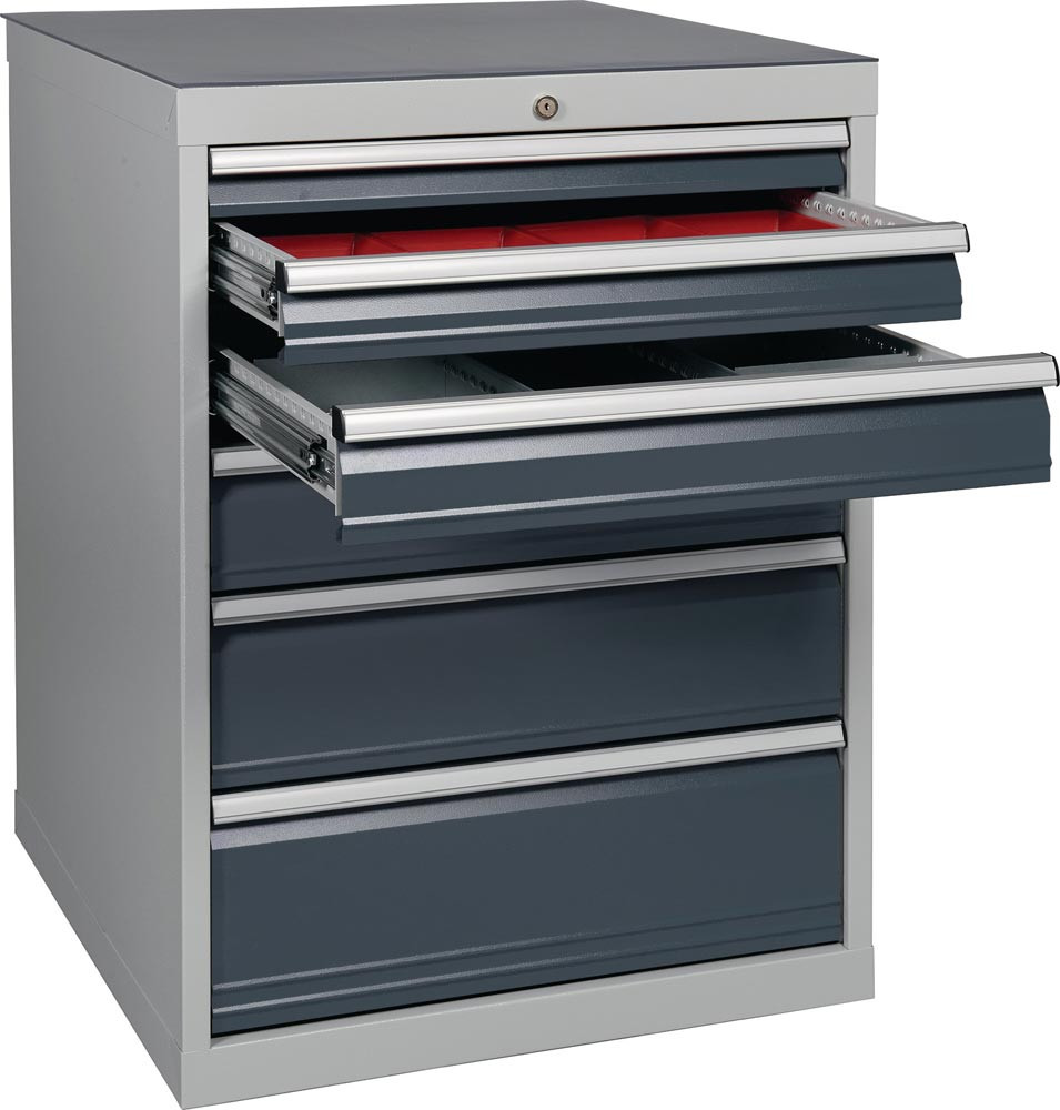 präzise Stahlblechkonstruktion mit robuster Pulverbeschichtung (Strukturlack) · Gesamttragfähigkeit 1500 kg · Schubladenführungen mit 100 % Vollauszug und absoluter Einzelauszugsperre mit Zentralverschluss · Aluminium-Griffleisten mit Beschriftungsstreifen und Klarsichtabdeckung · Innenmaße B 600 x T 600 mm · Tragfähigkeit pro Schublade 100 kg
