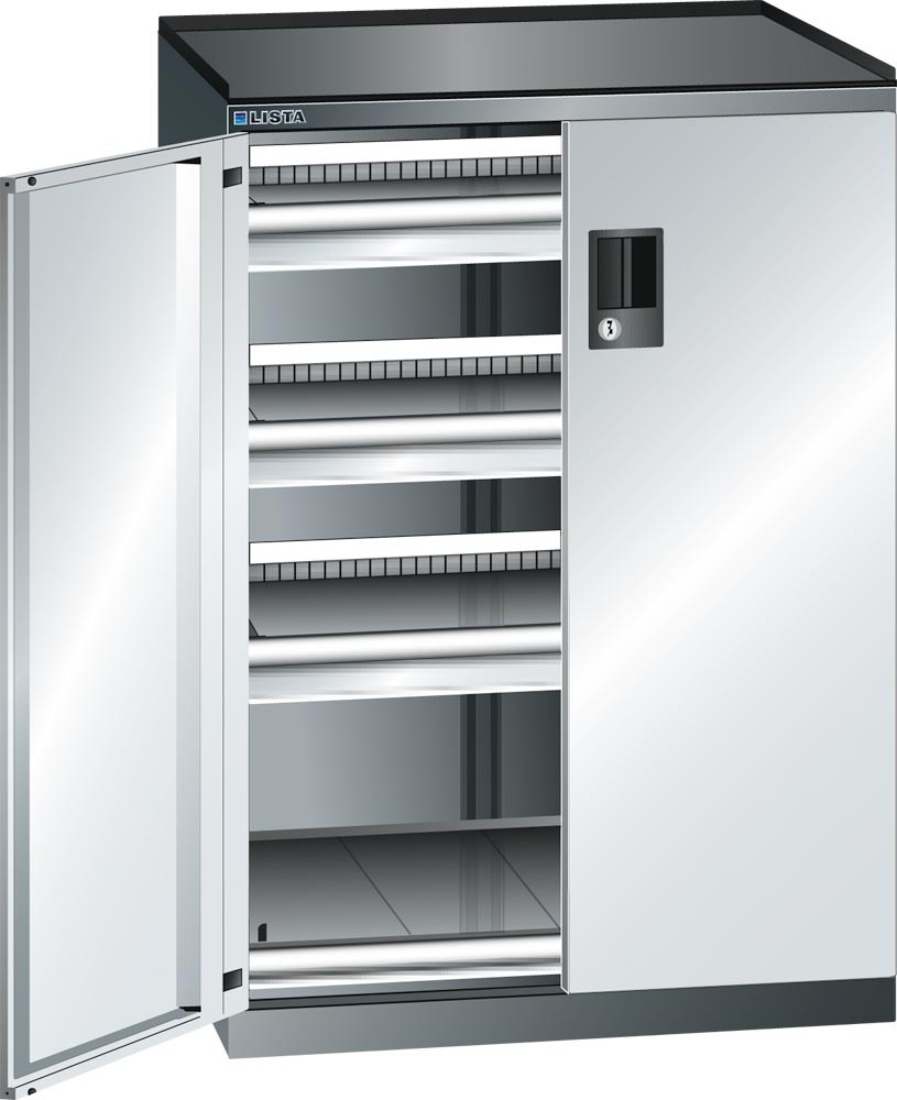 Schubladenschrank m. Flügeltüren, BxTxH 717x600x1020 mm, 3x75 Schubladen u. 1 Auszug 200 kg, Schloss, RAL 7035 E1986708