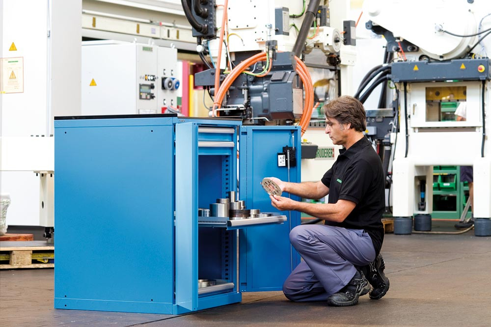 Schubladenschrank m. Flügeltüren, BxTxH 717x600x1020 mm, 4x75 Schubladen 75 kg, Schloss, RAL 5012 E1986713