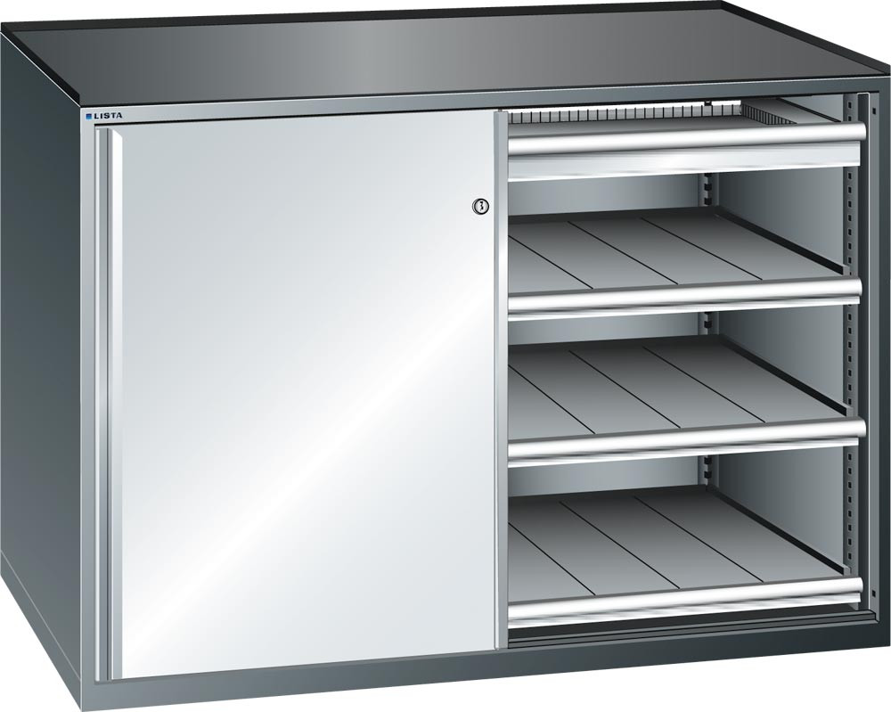 ∙ Aus hochwertigem, pulverbeschichtetem Stahlblech ∙ Optimal bei engen Raumverhältnissen ∙ Schiebetüren mit einer hohen Laufruhe ∙ Inneneinrichtung im 25 mm Raster in der Höhe verstellbar ∙ Mit Zylinderschloss ∙ Abrollrand 3-seitig inkl. Rillenmatte