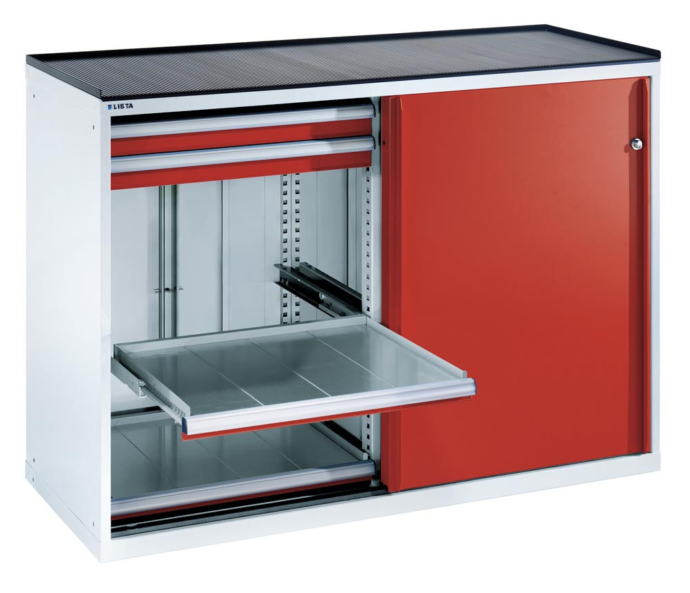 Schubladenschrank m. Schiebetüren, BxTxH 1430x780x1020 mm, 4 Schubladen 200 kg u. 2 Auszüge 200 kg, Schloss, RAL 5012 E1986789