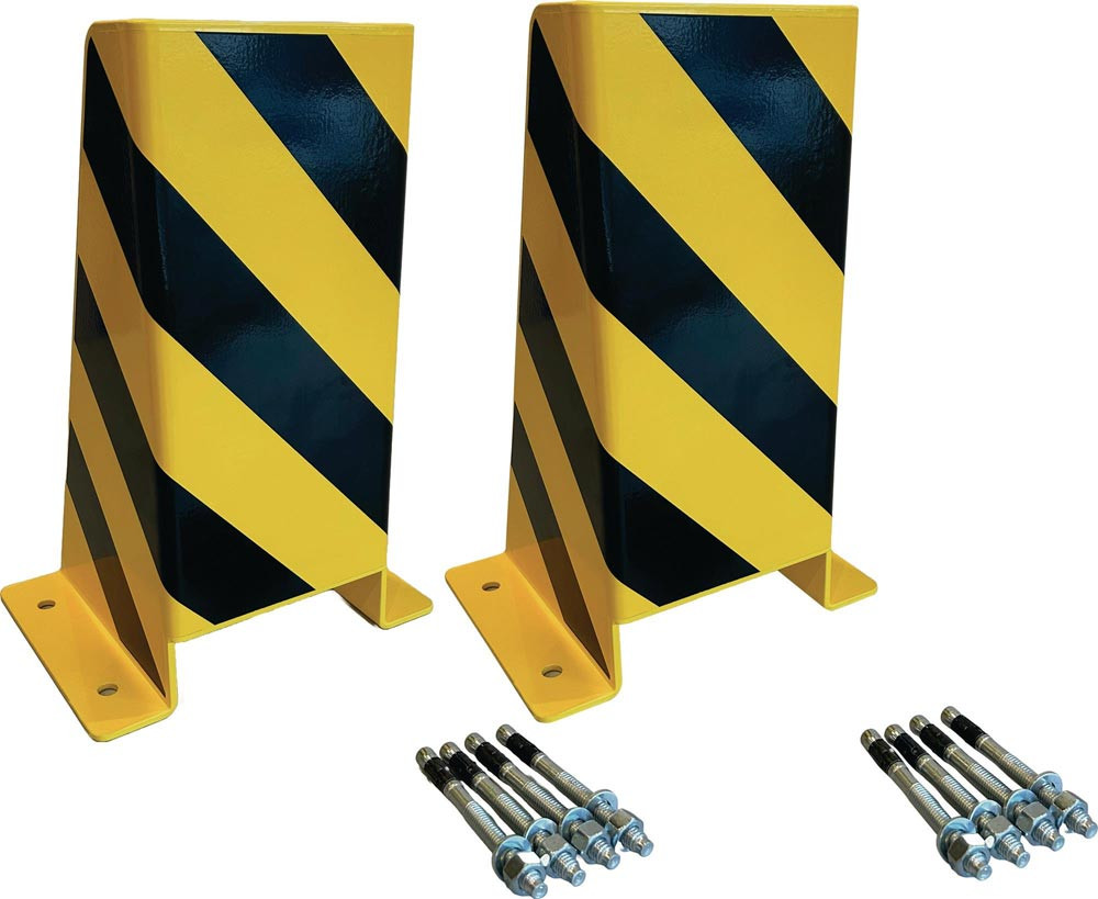 für Regalsysteme im Eck- und im Durchfahrtsbereich · aus gekantetem Stahlblech, Stärke 5 mm · Höhe 400 mm · pulverbeschichtet · verkehrsgelb, RAL 1023 mit Warnmarkierung tiefschwarz, RAL 9005 · inklusive Schwerlastanker zur Befestigung auf Betongrund