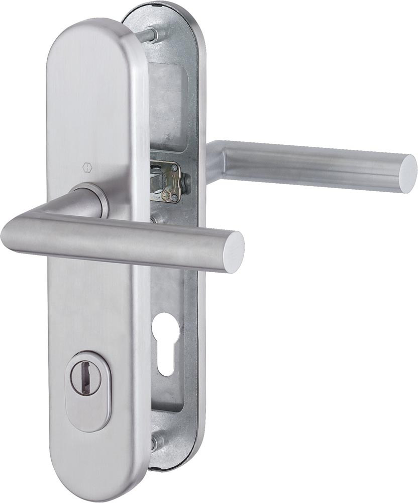 für Abschlusstüren · einbruchhemmend nach DIN 18257 · Stahl-Unterkonstruktion im Außen- und Innenschild · mit Rückholfeder-Paket · mit Zylinderabdeckung aus gehärtetem Stahl für vorstehende Zylinderlänge 10-18 mm · innen: loser Türgriff · mit Schnellstift-Verbindung · hochfeste, verdeckte Verschraubung · Knopfschild-Randhöhe: 15 mm · Lochung PZ · DIN links / rechts · einschließlich Befestigungsmaterial · Widerstandsklasse ES 1