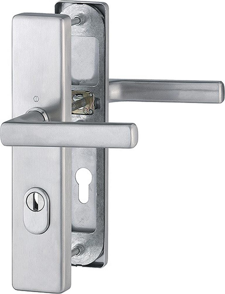 für Abschlusstüren · geprüft nach DIN 18257 · Stahl-Unterkonstruktion im Außen- und Innenschild · mit Rückholfeder-Paket · mit feststehendem Knopf · mit Zylinderabdeckung aus gehärtetem Stahl für vorstehende Zylinderlänge 10-18 mm · mit Schnellstiftverbindung · hochfeste, verdeckte Verschraubung · Lochung PZ · Edelstahl matt · DIN links / rechts · Widerstandsklasse ES 1
