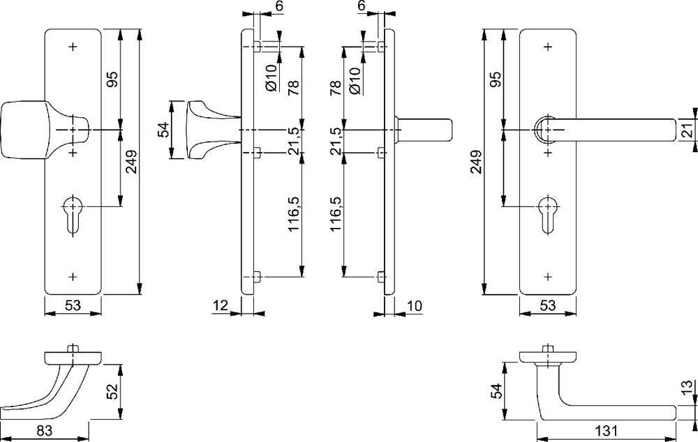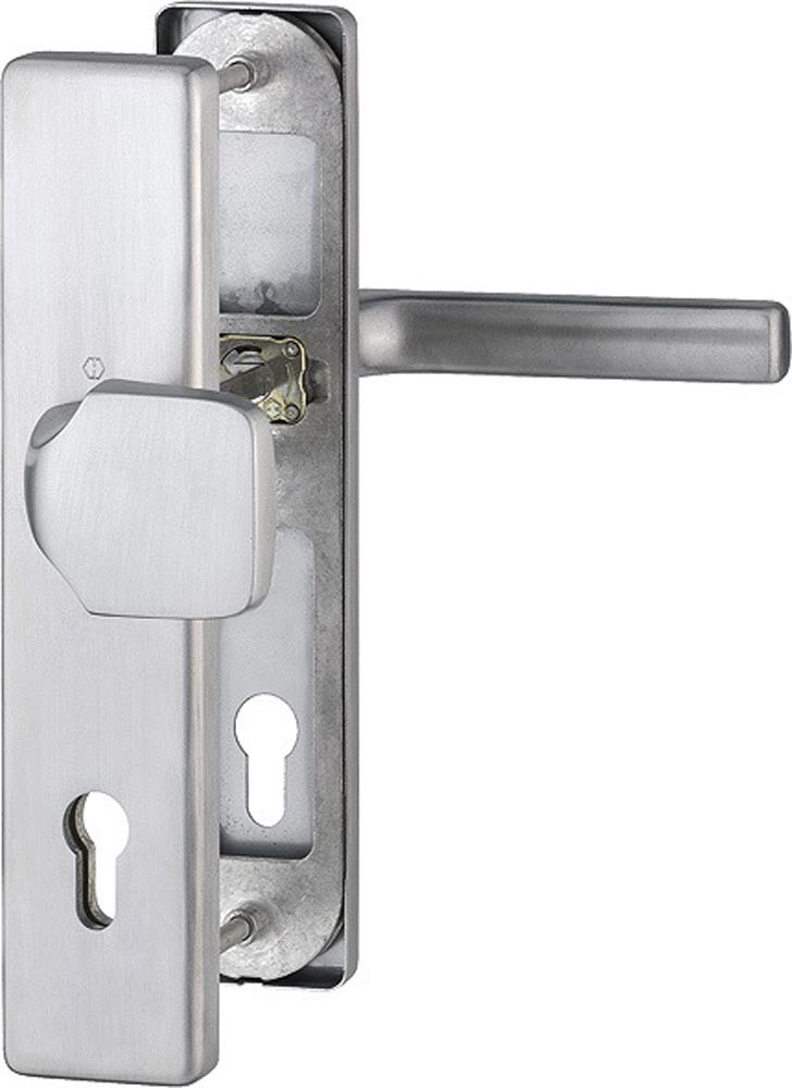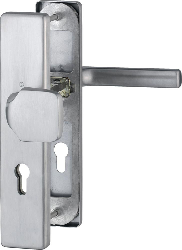 für Abschlusstüren · geprüft nach DIN 18257 · Stahl-Unterkonstruktion im Außen- und Innenschild · mit Rückholfeder-Paket · mit feststehendem Knopf · mit Schnellstiftverbindung · hochfeste, verdeckte Verschraubung · Lochung PZ · DIN links / rechts · Widerstandsklasse ES 1
