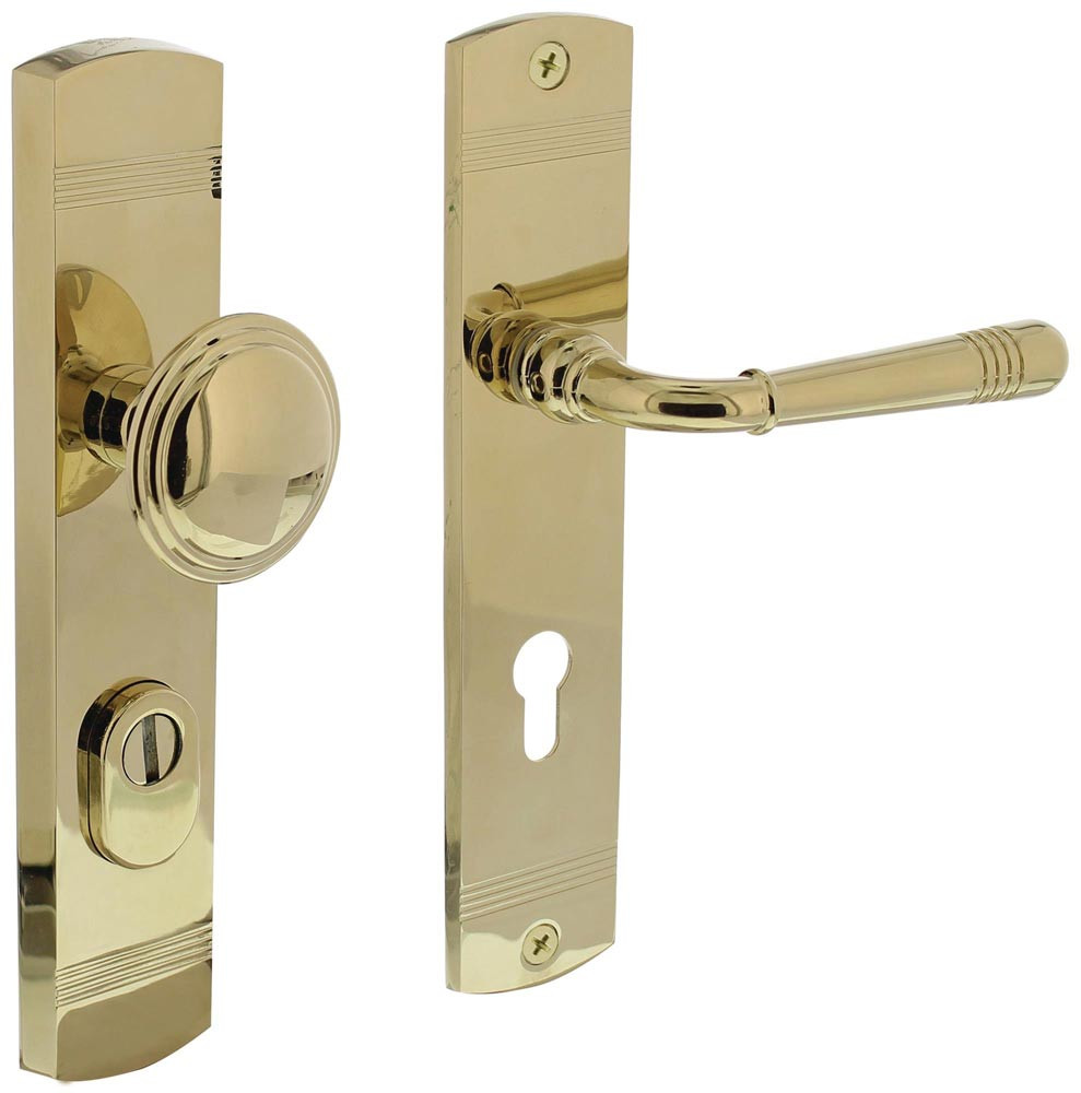 auf einem rechteckigen Schild · aus einer Zinklegierung gefertigt und mit einer messingfarbenen PVD-Beschichtung versehen, dadurch weniger anfällig für Korrosion · der Haustürbeschlag verfügt über einen Kernziehschutz, der den Zylinder vor dem Herausziehen und Aufbohren schützt · das Set besteht aus einem Außenknauf und einem passenden Griff für die Innenseite der Tür · links als auch rechts verwendbar · ist mit Laschen versehen, die ihm einen besseren Halt geben · das Schild federbelastet, so dass der Türgriff nach der Benutzung wieder in die waagerechte Position zurückspringt und für ein griffbetätigtes Mehrfachschloss geeignet ist · für Türstärke 38-42 mm · inkl. Befestigungsmaterial für die Montage