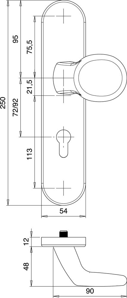 Grundkonstruktion: Druckguss mit 2 mm Teilstahleinlage im Außenschild, oberflächengehärtet · Stärke Innenschild = 8 mm · Drücker-Lagerung: lose · Drückertyp und -stärke: 108 mit Ø 22 mm · Knopfausführung bei Wechselgarnitur: Modell …/0272 und …/0292 = K2 (gekröpft), bzw. Modell …/0772 und …/0792 = K7 (gerade) · Stütznocken: M6, Ø 10 mm anbohrgeschützt · Verschraubung: 3-fach M6, verdeckt · Anbohrschutz beim Außenschild · Wechselgarnituren mit Spezialrollenwechselstift mit M12-Gewinde · DIN links / rechts · ohne Zylinderabdeckung · Widerstandsklasse ES1