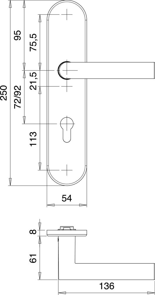 Grundkonstruktion: Druckguss mit 2 mm Teilstahleinlage im Außenschild, oberflächengehärtet · Stärke Innenschild = 8 mm · Drücker-Lagerung: lose · Drückertyp und -stärke: 108 mit Ø 22 mm · Knopfausführung bei Wechselgarnitur: Modell …/0272 und …/0292 = K2 (gekröpft), bzw. Modell …/0772 und …/0792 = K7 (gerade) · Stütznocken: M6, Ø 10 mm anbohrgeschützt · Verschraubung: 3-fach M6, verdeckt · Anbohrschutz beim Außenschild · Wechselgarnituren mit Spezialrollenwechselstift mit M12-Gewinde · DIN links / rechts · ohne Zylinderabdeckung · Widerstandsklasse ES1