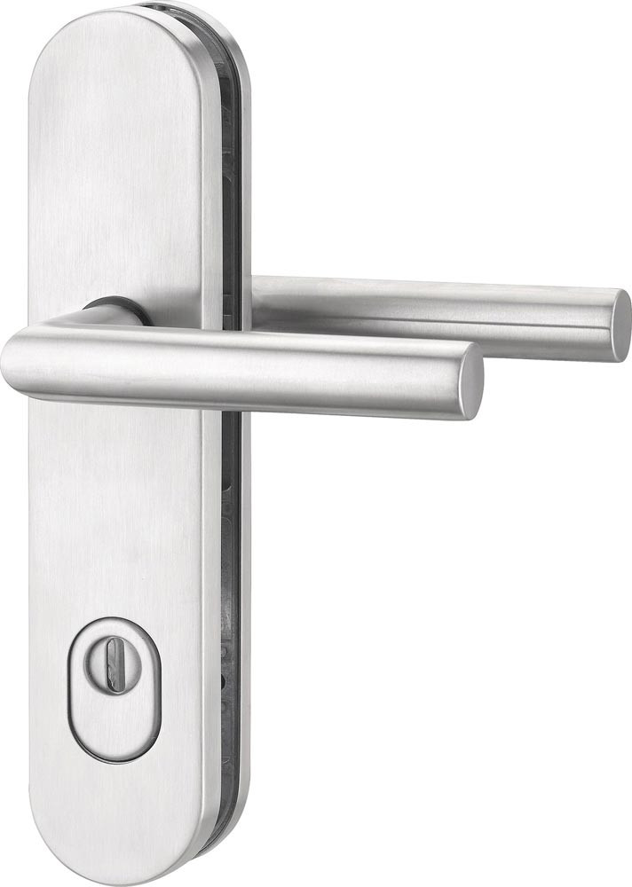 Drückergarnitur · Lochung PZ · Grundkonstruktion: Druckguss mit 2 mm Teilstahleinlage im Außenschild, oberflächengehärtet · Stärke Innenschild= 8 mm · Stütznocken: M6, Ø 10 mm, Verschraubung: 3-fach M6, verdeckt · Anbohrschutz beim Außenschild · mit Zylinderabdeckung: federnd gelagert für 12 - 17 mm Überstand · DIN links /rechts · Widerstandsklasse ES1