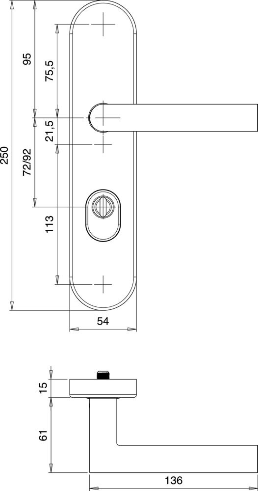 Drückergarnitur · Lochung PZ · Grundkonstruktion: Druckguss mit 2 mm Teilstahleinlage im Außenschild, oberflächengehärtet · Stärke Innenschild= 8 mm · Stütznocken: M6, Ø 10 mm, Verschraubung: 3-fach M6, verdeckt · Anbohrschutz beim Außenschild · mit Zylinderabdeckung: federnd gelagert für 12 - 17 mm Überstand · DIN links /rechts · Widerstandsklasse ES1