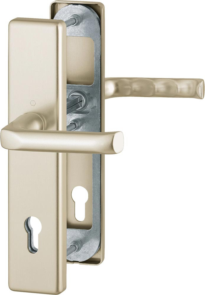 für Abschlusstüren · einbruchhemmend nach DIN 18257 · Knopfschild-Randhöhe: 12 mm · Stahlunterkonstruktion im Innen- und Außenschild · mit Rückholfeder-Paket (bei 8 mm Vierkant / NICHT bei 10 mm) · FDW-Profilstift-Verbindung · DIN links / rechts verwendbar · hochfeste, verdeckte Verschraubung · Lochung PZ · einschließlich Befestigungsmaterial · Widerstandsklasse ES 1