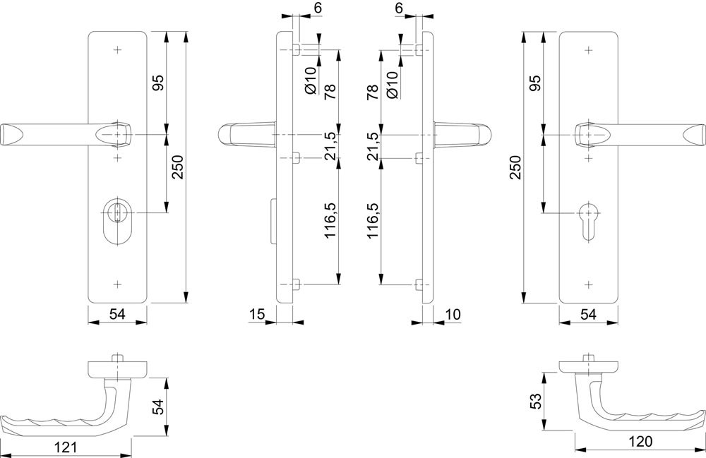 für Abschlusstüren mit ZA · geprüft nach DIN 18257 · Unterkonstruktion: außen Stahl, innen Aluminium, Stütznocken · Wechselgarnituren mit gekröpftem Knopf · Zylinderabdeckung: gehärteter Stahl, für vorstehende Zylinderlänge 10-18 mm · HOPPE FDW Profilstift-Verbindung · Lochung PZ · Widerstandsklasse ES 1 · Befestigung: verdeckt, durchgehend, Gewindeschrauben M6