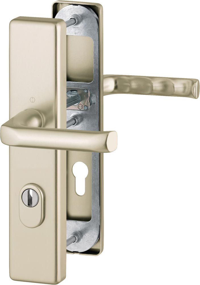 für Abschlusstüren mit ZA · geprüft nach DIN 18257 · Unterkonstruktion: außen Stahl, innen Aluminium, Stütznocken · Wechselgarnituren mit gekröpftem Knopf · Zylinderabdeckung: gehärteter Stahl, für vorstehende Zylinderlänge 10-18 mm · HOPPE FDW Profilstift-Verbindung · Lochung PZ · Widerstandsklasse ES 1 · Befestigung: verdeckt, durchgehend, Gewindeschrauben M6