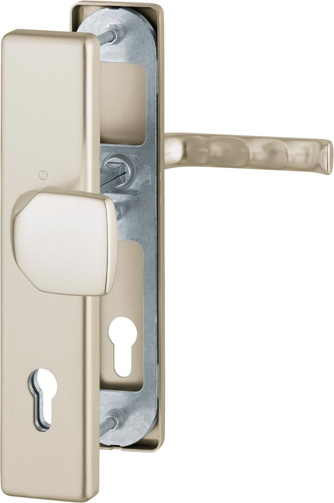 für Abschlusstüren · einbruchhemmend nach DIN 18257 · Knopfschild-Randhöhe: 12 mm · mit Rückholfeder-Paket (bei 8 mm Vierkant / NICHT bei 10 mm) · Wechselgarnitur mit gekröpftem Knopf lt. Abb. · FDW-Profilstift-Verbindung · DIN links / rechts verwendbar · Befestigung: verdeckt, durchgehend, Gewindeschrauben M6 · Lochung PZ · einschließlich Befestigungsmaterial · Widerstandsklasse ES 1 · Unterkonstruktion: außen Stahl, innen Aluminium, Stütznocken
