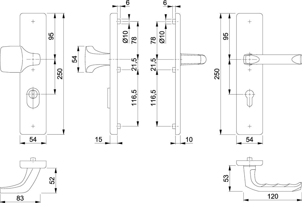 für Abschlusstüren mit ZA · geprüft nach DIN 18257 · Unterkonstruktion: außen Stahl, innen Aluminium, Stütznocken · Wechselgarnituren mit gekröpftem Knopf · Zylinderabdeckung: gehärteter Stahl, für vorstehende Zylinderlänge 10-18 mm · HOPPE FDW Profilstift-Verbindung · Lochung PZ · Widerstandsklasse ES 1 · Befestigung: verdeckt, durchgehend, Gewindeschrauben M6