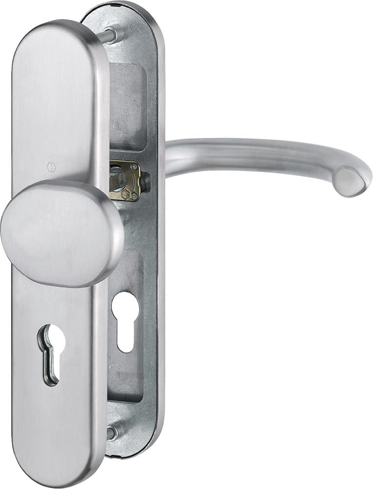 Edelstahl-Schutz-Langschild-Garnitur für Außen-/Wohnungsabschluss-Türen · geprüft nach DIN EN 1906: 37-0142A (SK2), zertifiziert nach DIN 18257 ES1, Objekt-Garnitur (Gebrauchs-Kategorie 3) · Lagerung: Türgriffe lose (Wechselgarnitur: außen gekröpfter Knopf fest, ummontierbar), Rückholfeder rechts/links verwendbar, wartungsfreies Gleitlager · Verbindung: HOPPE-Schnellstift mit HOPPE-Vollstift (Drückergrt., Stift-/Lochteil) / HOPPE-FDW-Vollstift (Wechselgrt., Lochteil) · Unterkonstruktion: außen Stahl, innen Zamak, Stütznocken · Befestigung: innen sichtbar, durchgehend, Gewindeschrauben M6 · Anschlagrichtung DIN links /rechts · Lochung PZ · Widerstandsklasse ES 1