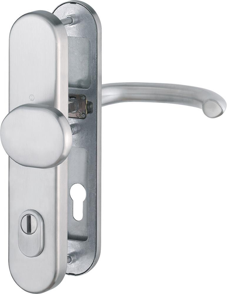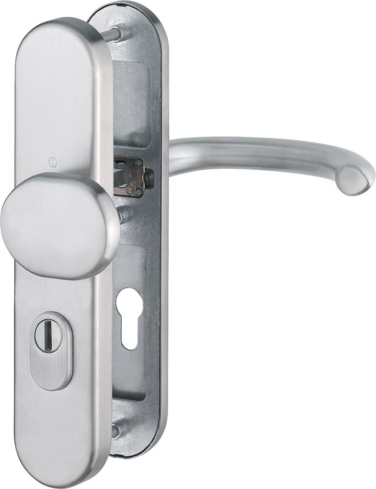 Edelstahl-Schutz-Langschild-Garnitur mit Zylinderabdeckung für Außen-/Wohnungsabschluss-Türen · geprüft nach DIN EN 1906: 37-0142A (SK2), zertifiziert nach DIN 18257 ES1, Objekt-Garnitur (Gebrauchs-Kategorie 3) · Lagerung: Türgriffe lose (Wechselgarnitur: außen gekröpfter Knopf fest, ummontierbar), Rückholfeder rechts/links verwendbar, wartungsfreies Gleitlager · Verbindung: HOPPE-Schnellstift mit HOPPE-Vollstift (Drückergrt., Stift-/Lochteil) / HOPPE-FDW-Vollstift (Wechselgrt., Lochteil) · Zylinderabdeckung: gehärteter Stahl, für vorstehende Zylinderlänge 10-18 mm · Unterkonstruktion: außen Stahl, innen Zamak, Stütznocken · Befestigung: innen sichtbar, durchgehend, Gewindeschrauben M6 · Anschlagrichtung DIN links / rechts · Lochung PZ · Widerstandsklasse ES 1