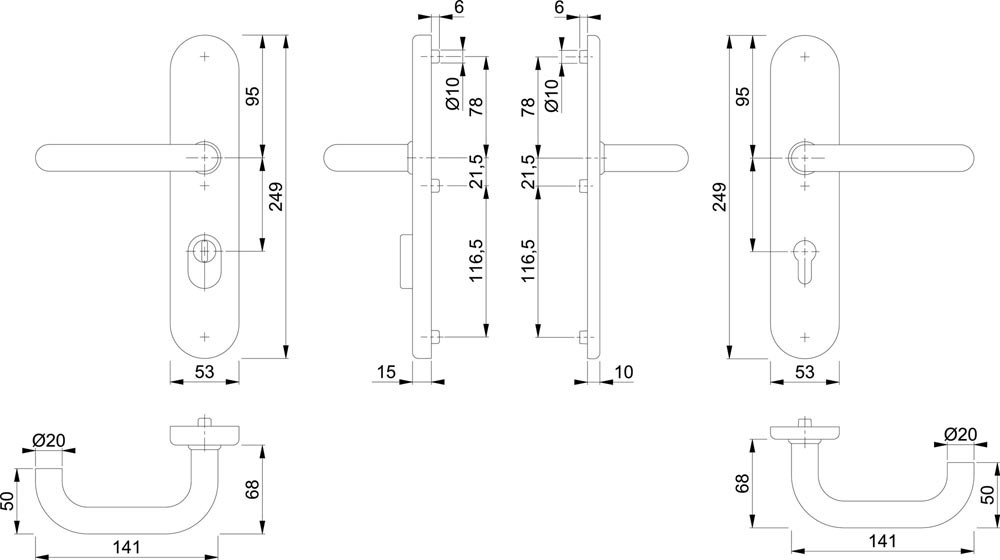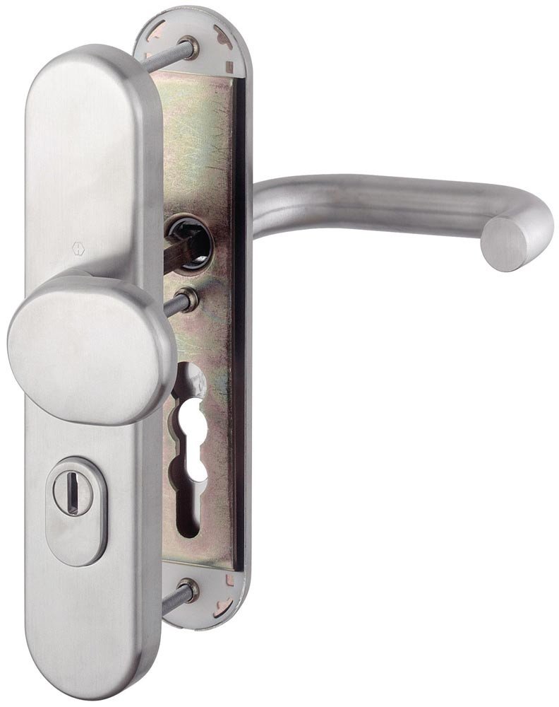 für Abschlusstüren · einbruchhemmend nach DIN 18257 · Stahl-Unterkonstruktion im Außen- und Innenschild · mit Rückholfeder-Paket · Zylinderabdeckung aus gehärtetem Stahl für vorstehende Zylinderlänge 10-18 mm · innen: loser Türgriff · mit Schnellstift-Verbindung · hochfeste, verdeckte Verschraubung · Knopfschild-Randhöhe: 15 mm · Lochung PZ · DIN links und rechts verwendbar · einschließlich Befestigungsmaterial · Widerstandsklasse ES 1